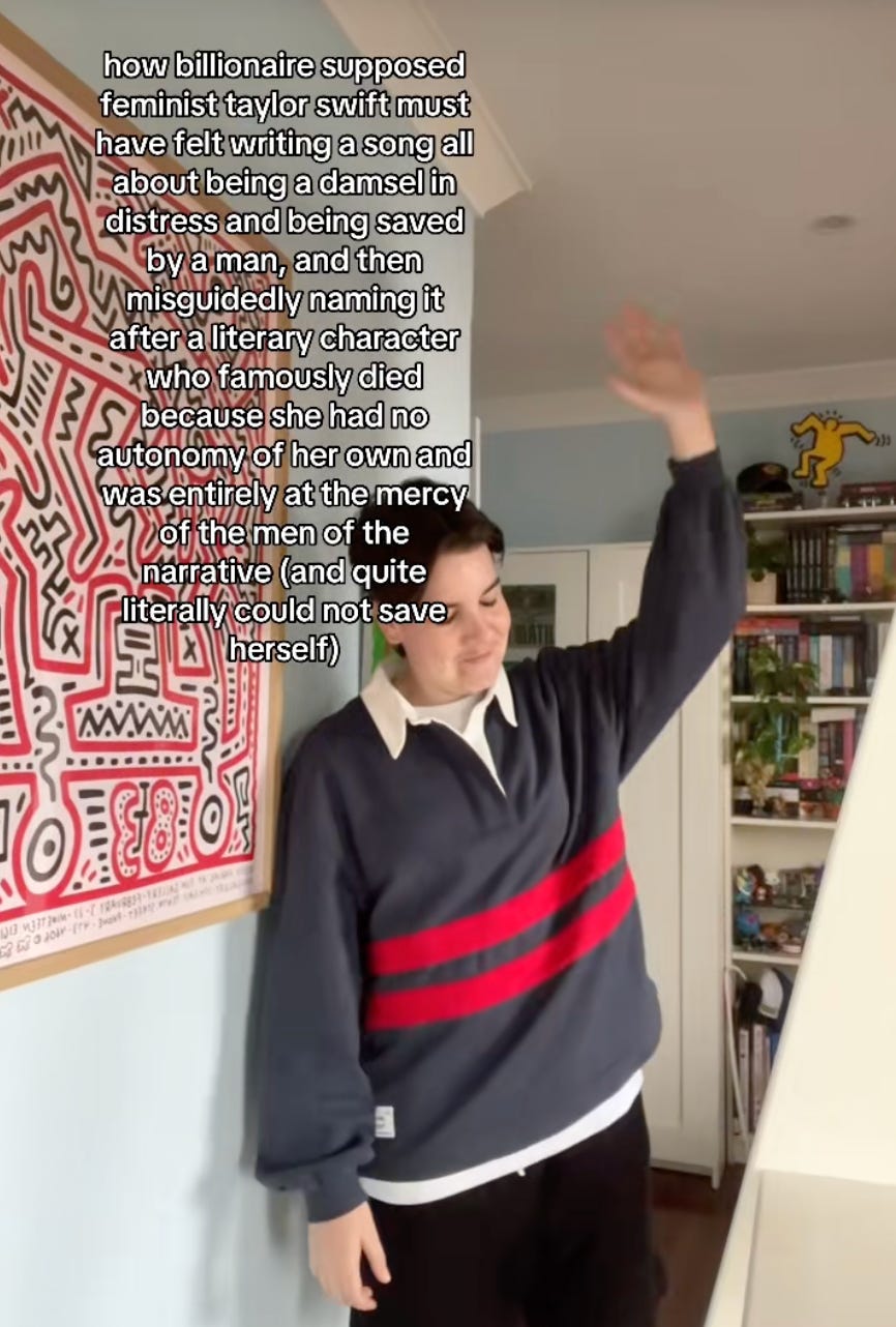 Swift has faced some backlash (by which I mean, some disgruntled TikToks, tweets etc) for the messaging of this song, which seems to be: Poor Ophelia! She should have just waited it out until a nicer man came along!