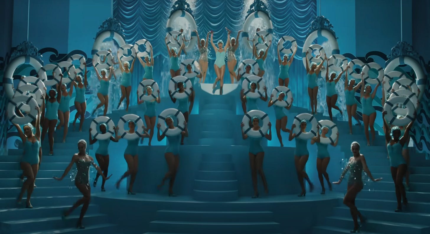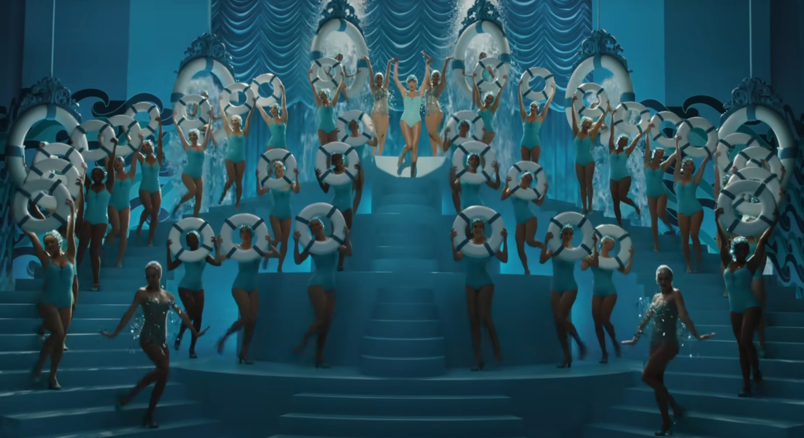The music video is even more farcical. It follows Swift through a variety of scenes, beginning with her own version of the Milais painting, then moving to a ship on which she fights a group of pirates(?) — when she is thrown overboard, instead of drowning, she appears in a glittery swimming costume and cap, dancing in triumphant sync with a score of dancers bearing lifebuoys. I can’t help but interpret this, tonally, as: maybe she drowned — but I’m having the time of my life!!!