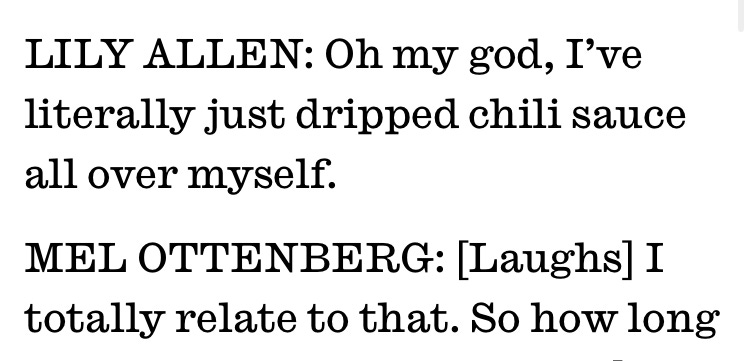 What does it mean, I ask you, to relate to the act of someone spilling chili [American spelling] sauce all over themselves? It seems to me to mean nothing, and is instead the kind of inane, pointless statement people make just for the sake of saying something or, in this case, for the sake of soothing a celebrity’s ego. Which is fine — obviously, I have said countless things in my lifetime that were ultimately pointless, and I have also lost control of my wits and senses in the presence of celebrity. I just think, if I was Editor-in-Chief of a magazine about interviews, and we were publishing an interview I had done, I probably would have fought tooth and nail to have that particular remark struck from the record.
