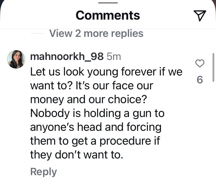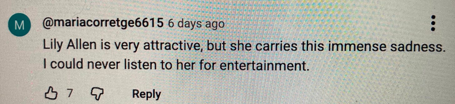 What I found, though, when going through my screenshot folder, was that most of the internet ephemera I had saved over the years was not from articles or interviews, but from the comments section. Take this example, also Lily Allen-focused, from a clip on YouTube of her and Miquita Oliver’s podcast Miss Me?: