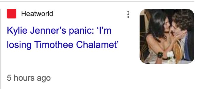 Kylie Jenner’s panic: ‘I’m losing Timothee Chalamet’. When I saw this headline I not only smiled but, in fact, laughed, and knew I had to somehow keep it with me forever. I was touched by the idea of cultural titan Kylie Jenner referring to her boyfriend by his first and last name, in a panicked tone, and speaking of their potentially imminent breakup as though he were slipping into a coma. Even more, I was tickled by the certainty that nothing of the sort ever happened, and instead someone, or some computer, had invented the whole thing so that people would click and read the article, which no doubt would be filled with information and turns of phrase even more useless than this one.